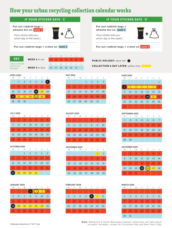 For those on the Masterton Coast (Tinui, Riversdale and Castlepoint) and the South Wairarapa coastal and rural areas (Ngawi, Tora and White Rock), there’s no change to your rubbish and recycling collections — just continue to use your existing recycling bins as usual. You can take excess material to your local transfer station.